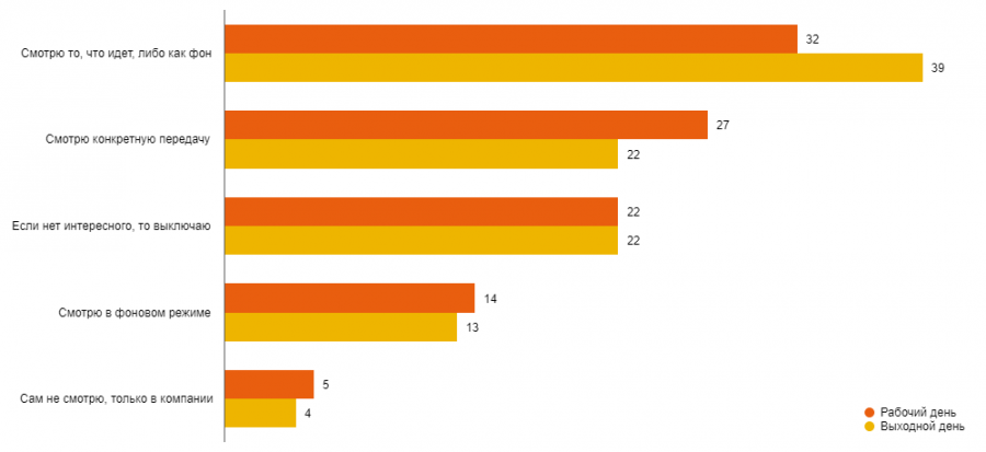 Высокий показатель ежедневного смотрения телевидения не означает для людей значимости этого канала. В отчете Deloitte приведены данные о форматах медиаактивности, которые явно указывают на то, что телевизор зачастую работает в фоновом режиме, а какую-то определенную передачу смотрит в лучшем случае один из четырех человек.