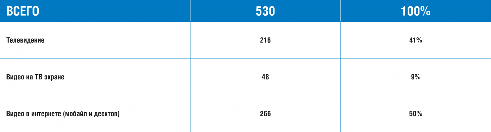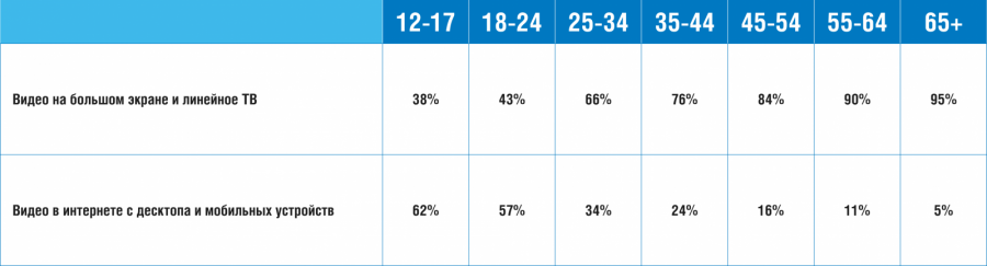 Население старше 45 лет предпочитает линейное ТВ, а более молодые жители России — от 12 до 44 лет — активно выбирают интернет. При этом самая востребованная аудитория для рекламодателей — от 25 до 45 лет — распределяет свое время следующим образом: 61% приходится на интернет, 39% — на телевидение и другое видео с ТВ-экранов.