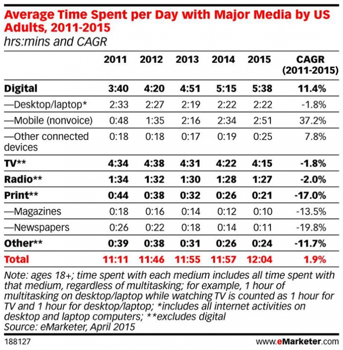 В 2015 году среднестатический взрослый американец будет тратить на медиапотребление более половины суток, прогнозирует eMarketer. Последние пять лет этот показатель рос на 1,9% ежегодно. Согласно исследованию, цифровые медиа успешно завоевывают внимание потребителя, на них приходится 5 часов 38 минут в день.