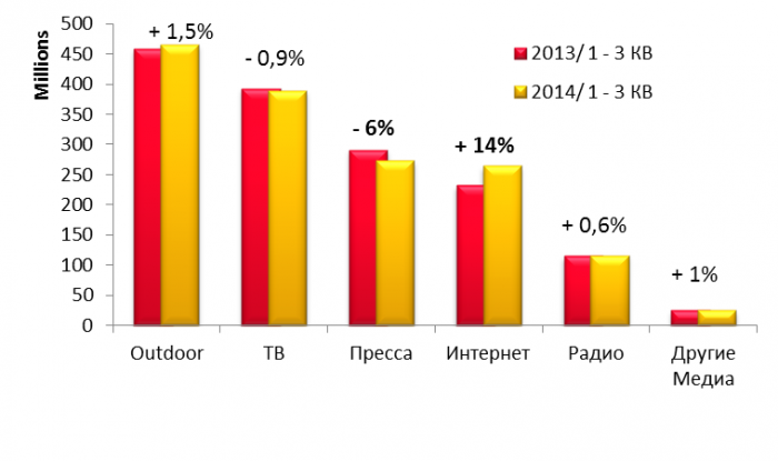 Давайте подробнее рассмотрим отдельные сегменты рынка Челябинска, и динамику их бюджетов к концу третьего квартала 2014 года.