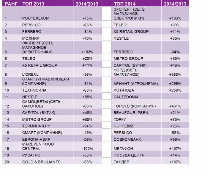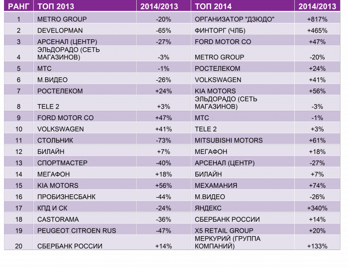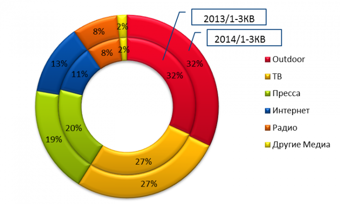 Практически все топовые рекламодатели увеличили свои вложения в сегмент в 2014 году, в целом по топ 20 это составило +39% от бюджетов первых трех кварталов 2013 года. Именно они обеспечили, пусть незначительный, но рост сегмента. Средние и мелкие рекламодатели в целом снизили свои рекламные расходы на 5%. Поскольку концентрация бюджетов у топовых рекламодателей невелика, чуть более 20% от бюджетов сегмента, рост по сегменту составил только 1%.