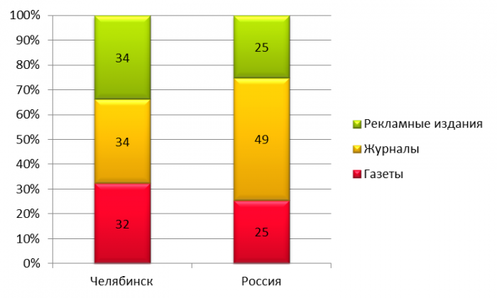В то же время, структура печатного сегмента в Челябинске такова, что разные типы изданий имеют примерно равные доли в региональных бюджетах прессы. Доля рекламных изданий в регионе при этом несколько больше, чем в национальном сегменте, и меньше, чем в городах-миллионниках с традиционно сильной прессой (как в Нижнем Новгороде, например, где их доля - 56%).