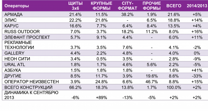 В декабре 2013 года и июне 2014 года в Челябинске прошли аукционы, на которых перераспределялись права на наружные рекламные конструкции города между операторами. Такие аукционы можно было наблюдать во многих регионах России в 2013-2014 годах. В отличие от других крупных городов, таких как Казань, Нижний Новгород, Самара, Краснодар, где аукционы привели к существенному уменьшению числа операторов и конструкций, росту цен, - Челябинский рынок наружной рекламы практически не почувствовал на себе их воздействия. Если на сентябрь 2013 года в outdoor- секторе Челябинска работало 106 операторов, то к сентябрю 2014 года осталось 96, т.е. их число сократилось только на 9%. Первая десятка операторов, которая в 2013 году держала 81% всех рекламных поверхностей города, сохранила свое лидерство и в 2014 году, уже после двух волн аукционов, сохранив и объем принадлежащих им конструкций (82%). Общее число рекламных поверхностей так же осталось неизменным. В то же время произошло перераспределение инвентаря по типам конструкций.