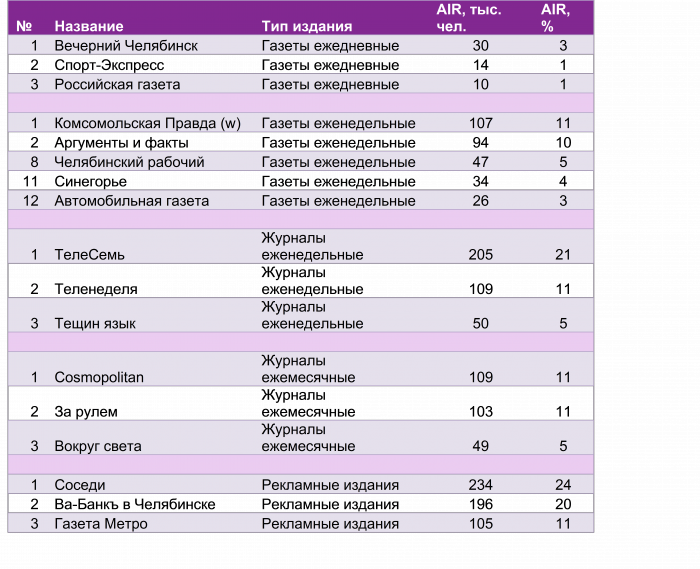 Практически все медиа в Челябинске имеют сильных региональных игроков: телеканалы, радиостанции; и пресса тут - не исключение. Среди региональных печатных изданий больше всего газет. Они не потеряли, а наоборот, увеличили свои бюджеты относительно 2013 года. Их рост в целом составил порядка 7%. В то время, как журналы, среди которых лидируют, главным образом, «центральные» издания в целом потеряли около 9% от бюджетов трех кварталов прошлого года. Рекламные издания потеряли 12% своих бюджетов в 2014 году. При этом падение коснулось не только «центральных» рекламных изданий с региональными вставками, но и собственно региональные издания. На динамике сказалось сокращение объемов рекламных полос во многих «центральных» изданиях. Так, например, «Комсомольская правда» сократила площадь рекламных полос на 21%, «Российская газета» - 17%, «Аргументы и факты» - 9%, «Итоги» - 87%, «Вокруг света» - 21%, «За рулем» - на 20%, «Из рук в руки» - на 35%. Региональные информационные издания, таким образом, наоборот, несколько стабилизировали сегмент прессы в Челябинске и уменьшили степень его падения.