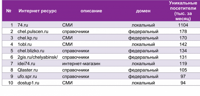 «Деловой квартал» летом 2014 года составил Топ-35 региональных челябинских порталов, среди которых также встречаются федеральные проекты с региональным контентом. Наиболее популярные федеральные проекты – это справочник chel.pulscen.ru, который собирает трафик с коммерческих запросов пользователей в интернет-поисковиках, и chel.kp.ru - региональная страница федерального СМИ, которая привлекает пользователей обилием вкладок по совершенно различным интересам: новости, спорт, дача, работа, игры и др. Все они, однако, по аудиторным показателям не могут сравниться с локальным лидером топа 74.ru.