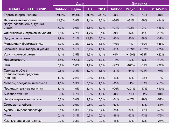 В сегменте наружной рекламы и телевидения сильно выросла категория МЕДИЦИНА и ФАРМАЦЕВТИКА – на 40% и 60%. Рост произошел в связи с некоторыми изменениями в законодательстве регулирующем размещение рекламы в СМИ в июне 2014 года. Реклама медицинских услуг ранее разрешалась только в местах проведения медицинских или фармацевтических выставок, семинаров и конференций, и в профильных медицинских СМИ, - сейчас ее можно размещать в любых СМИ.