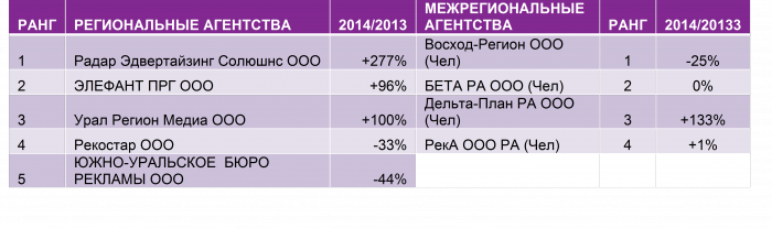 73% региональных рекламодателей в Челябинске размещаются напрямую в СМИ, без помощи агентств, в то время как на рынке существует и функционирует множество подобных компаний. Самые крупные из них – это межрегиональные «Восход Регион», челябинский филиал «Дельта-План Сибирь», агентство «Бета РА» и «Река». В городе также работают порядка 30 агентств, специализирующихся в наружной рекламе, примерно столько же – в телевизионном сегменте. Тем ни менее, постоянных агентств, особенно таких, которые бы предлагали клиентам услуги полного цикла немного. Можно сказать, что рынок агентств в регионе только формируется. На сегодняшний момент только треть из вновь появившихся агентств после года работы остаются на рынке. Не первый год в Челябинске работают «ЭЛЕФАНТ», «ЮЖНО-УРАЛЬСКОЕ БЮРО РЕКЛАМЫ», «Рекостар». В несколько раз в 2014 году увеличило свою активность агентство «Радар Эдвертайзинг Солюшнс», которое по собранным бюджетам обошло межрегиональные агентства «ВОСХОД-РЕГИОН» и «Бета РА».