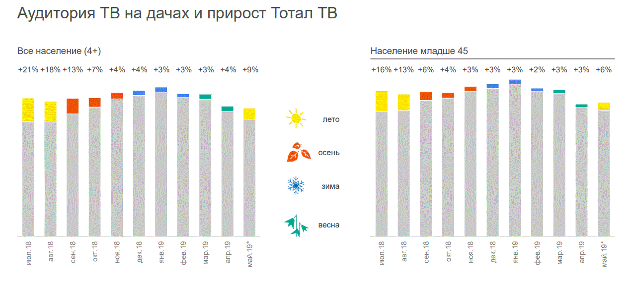 Измеритель предоставляет данные по дачному телесмотрению с 2018 года. Предварительные результаты исследования были собраны во время активного дачного сезона-2018 и озвучены в прошлом августе. В Mediascope отмечают, что наиболее высокий прирост к классическому домашнему просмотру дачи дают в летний сезон — на уровне 20% (аудитория 4+). С приближением зимы объем телепросмотра на дачах постепенно снижается, но даже в зимние месяцы он дает около 3% прироста к домашнему.
