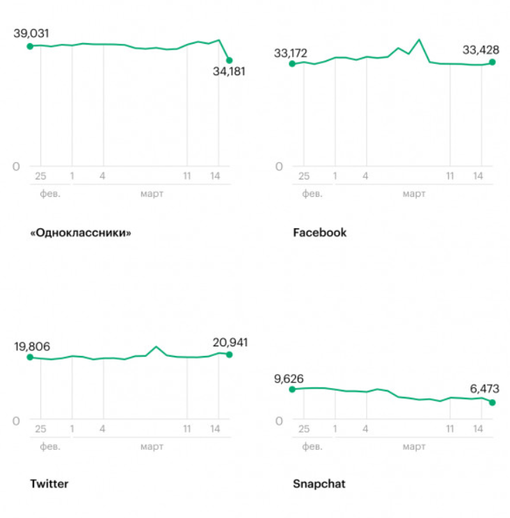 За сутки с момента блокировки Instagram его аудитория снизилась на на 16% (с 39 млн до 34 млн пользователей). При этом 14 марта был отмечен пик ежедневной посещаемости. Twitter потерял более 50% аудитории после блокировки 4 марта (с 2,6 млн до 1,2 млн).