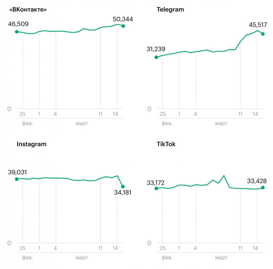 Как следует из данных Mediascope, снижение аудитории глобальных соцсетей на фоне их блокировки в России способствовало увеличению трафика на локальных диджитал-площадках: к 14 марта аудитория Telegram уже насчитывала 47,3 млн человек, а количество пользователей «ВКонтакте» к 15 марта достигло отметки в 50,3 млн.