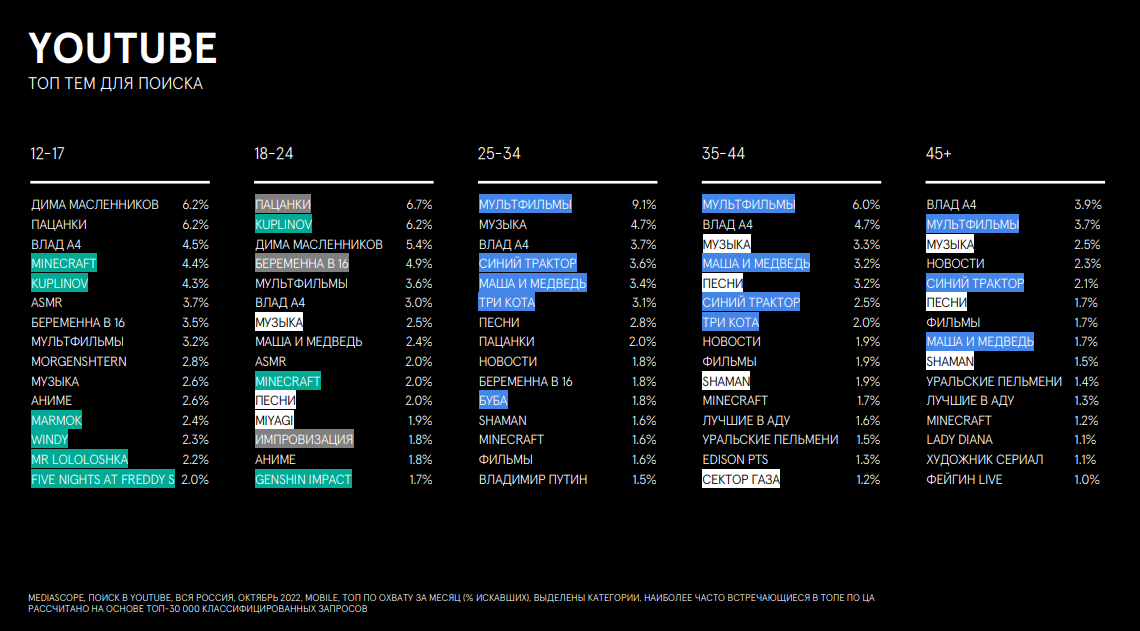 В ходе выступления Суанова также отметила, что к началу ноября 2022 года время потребления среди населения видео на YouTube увеличилось по сравнению с аналогичными периодом прошлого года. Чаще всего россияне ищут на площадке музыку (19%), развлекательные ролики (18%) и детский контент (12%).