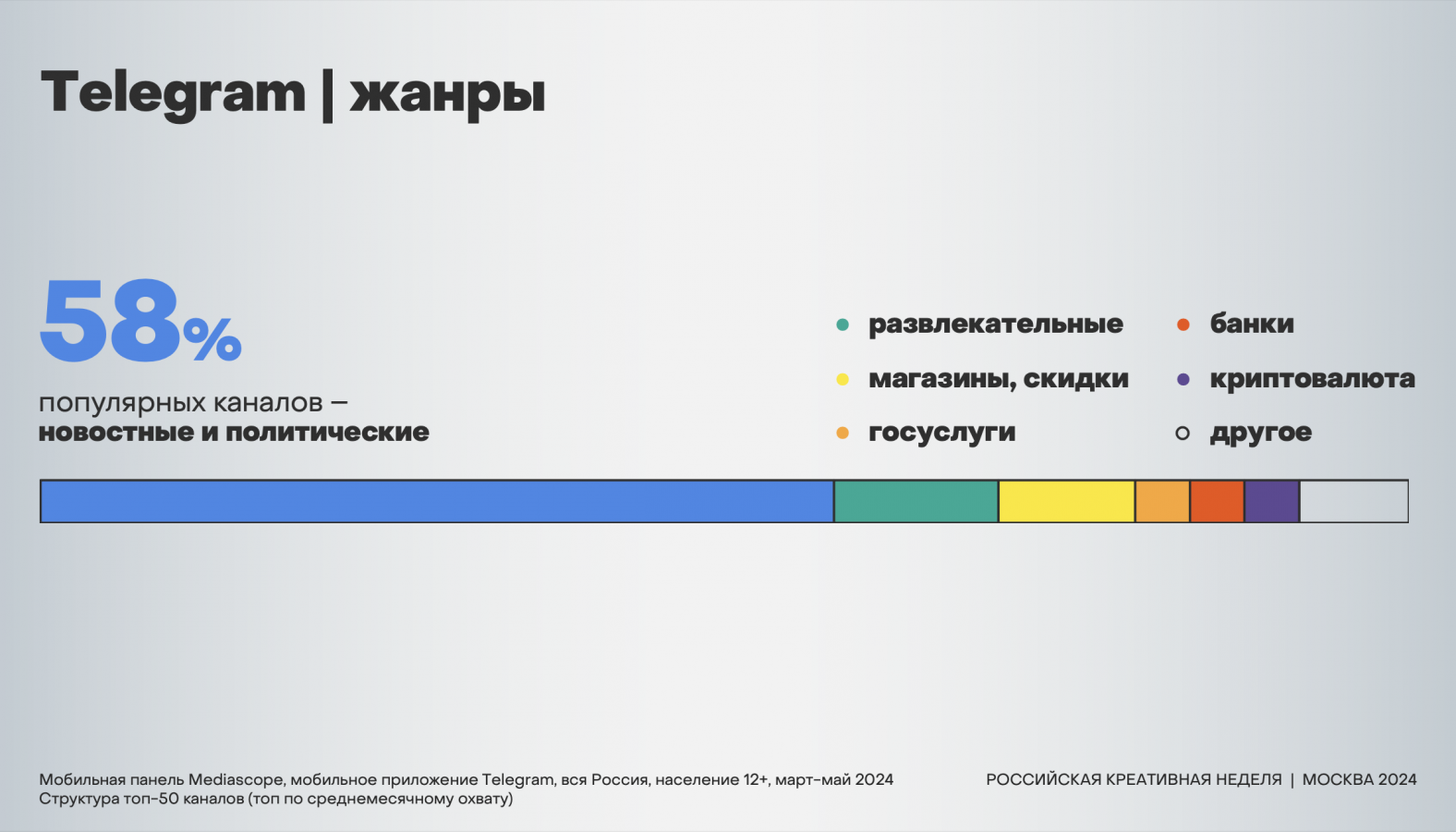 Такое распределение пользовательской активности показывает, что Telegram становится всё более важным источником новостей, заменяя привычные форматы СМИ. В пользу выбора Telegram говорят такие факторы, как трансляция информации практически в режиме реального времени, разнообразие точек зрения и отсутствие цензуры. В целом, мы видим, что мессенджер идет по пути WeChat c веб-аппами и каналами, поэтому стоит делать упор на свою площадку.