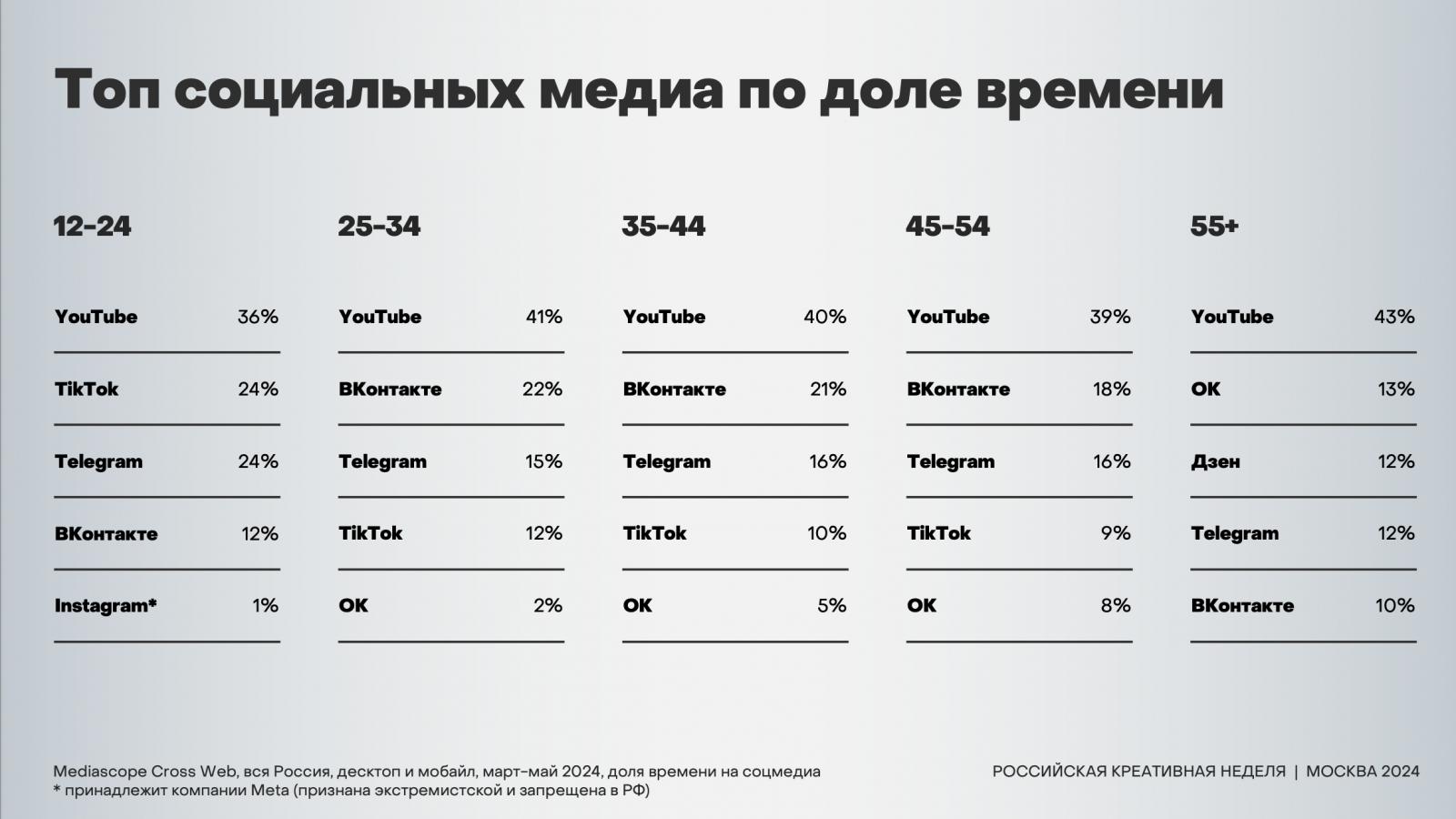 Если рассматривать соцмедиа по доле времени, на первом месте у всех возрастных групп расположился YouTube. На втором месте у людей в возрасте от 25 до 54 лет популярен «ВКонтакте», у поколения старше 55 — «ОК». У молодежи от 12 до 24 популярен TikTok, несмотря на приостановку его деятельности. Эта платформа полюбилась аудиторией уже давно, став не просто соцсетью, но и частью лайфстайла, поэтому молодежь не может про неё забыть, считают в feedstars.