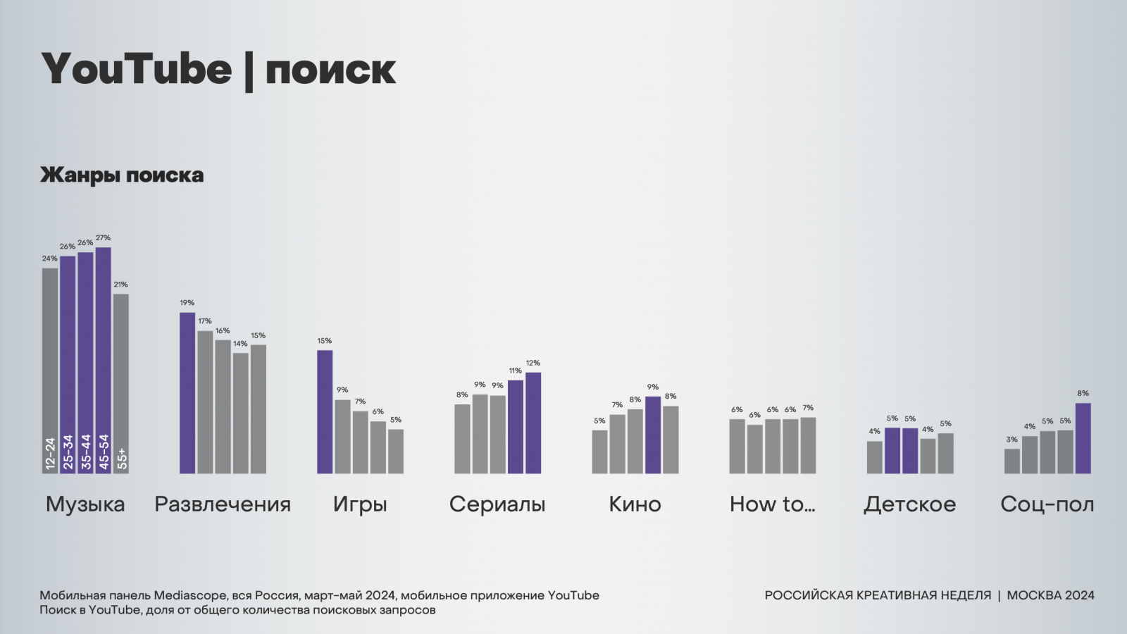 Среди жанров поиска на YouTube лидирует «музыка» — её ищут в 25% случаев. Это может быть связано с тем, что для прослушивания музыки, в особенности зарубежных исполнителей, чье творчество стало труднодоступным в легальном поле, YouTube требует поиска через строку, рассказывает Алина Фомина. Также это легальный способ слушать музыку бесплатно, еще и с визуальным сопровождением, дополняют в feedstars.