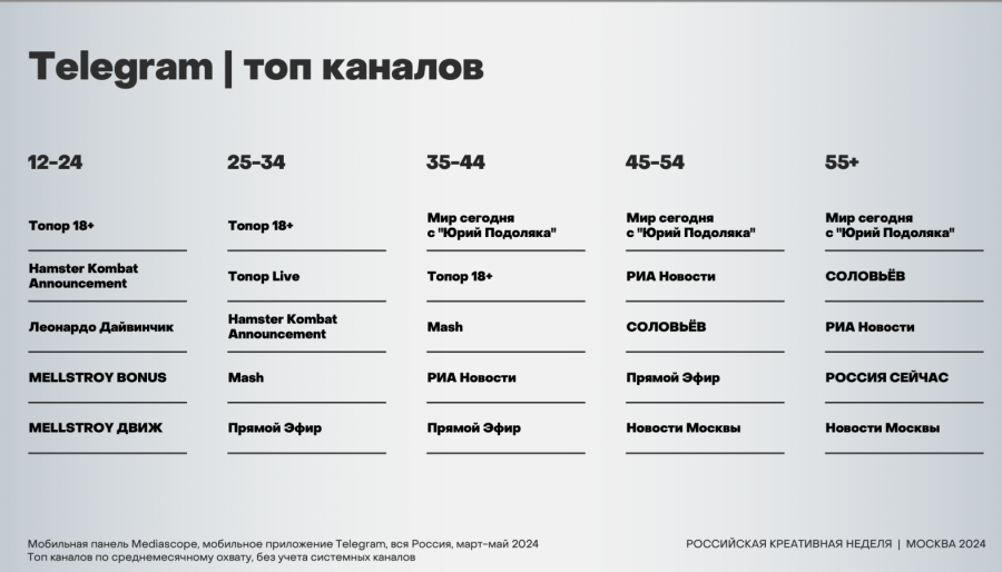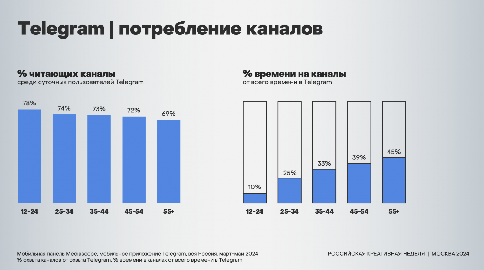 74% среднесуточных пользователей Telegram читают какие-либо каналы. В среднем, на чтение каналов у пользователей старше 12 лет уходит 24% всего времени на площадке. Этот показатель растёт с возрастом и достигает 45% в группе 55+ лет, следует из данных Mediascope. Люди старшего поколения чаще интересуются новостями, политикой и экспертными мнениями, поэтому и тратят время на чтение соответствующей информации, считает Айта Лузгина, директор по маркетингу Twiga Россия.