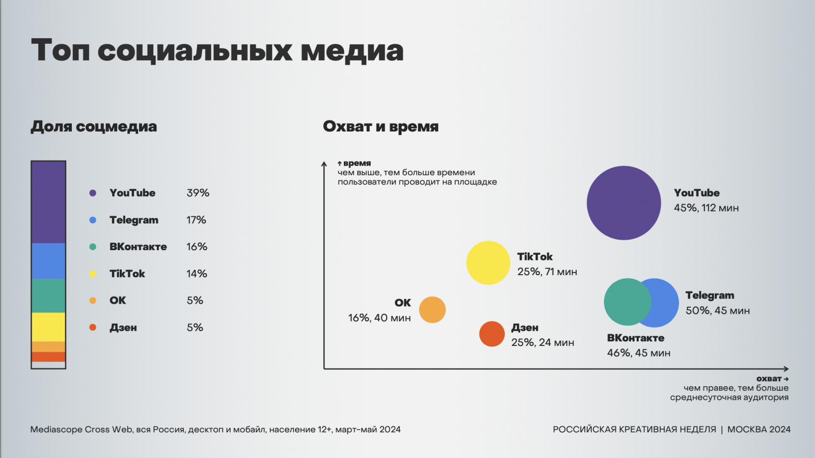 Первое место по охвату занимает YouTube — аудитория составляет 96,1 млн человек. Это 79% населения России старше 12 лет. На втором месте разместился «ВКонтакте» — 90,1 млн человек, далее следуют Telegram (85,3 млн человек), «Дзен» (80.3 млн человек), TikTok (67.2 млн человек) и «OK» (50.9 млн человек).