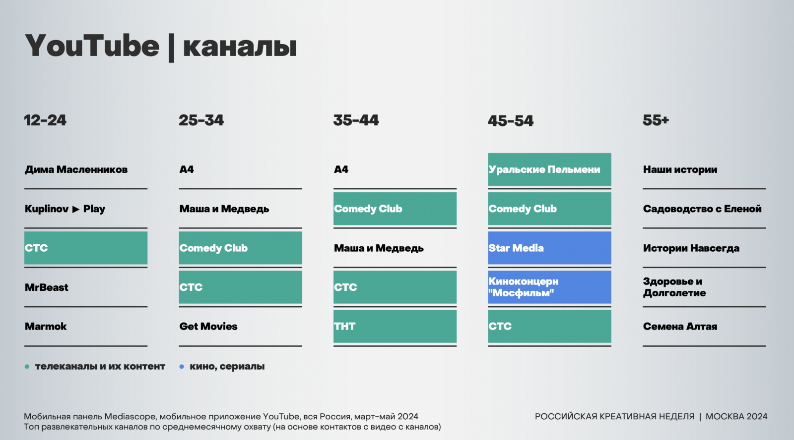 В топе развлекательных каналов на YouTube разместились А4, «Маша и Медведь», СТС, «Уральские пельмени», Comedy Club, MrBeast, «Дима Масленников» и Kuplinov Play. Телеканалы и их контент занимают второе-третье места у аудитории всех возрастов, а у возрастной группы 44−54 — все позиции топ-5.