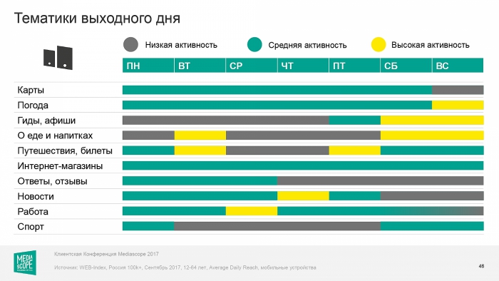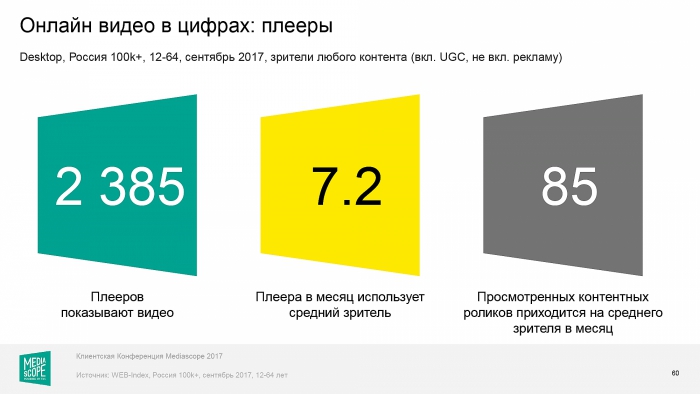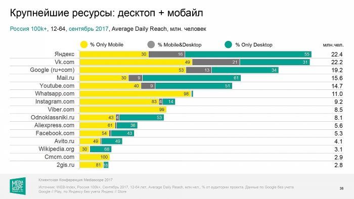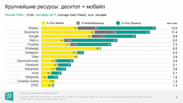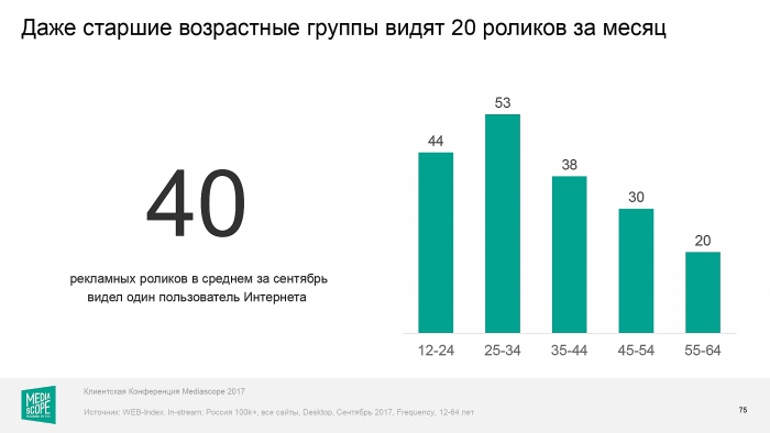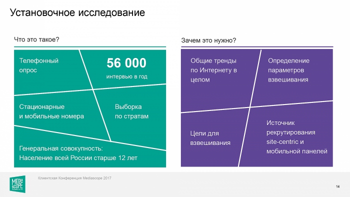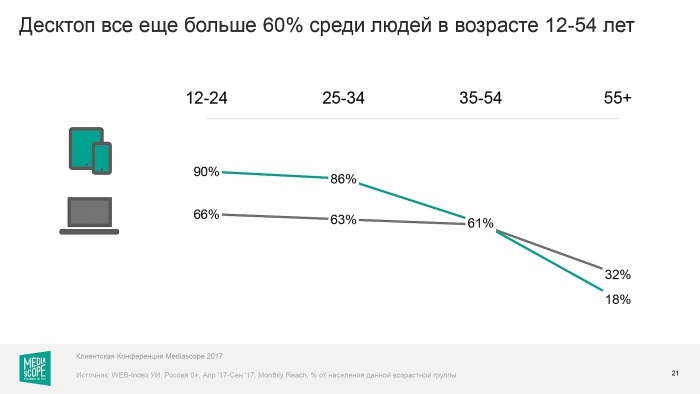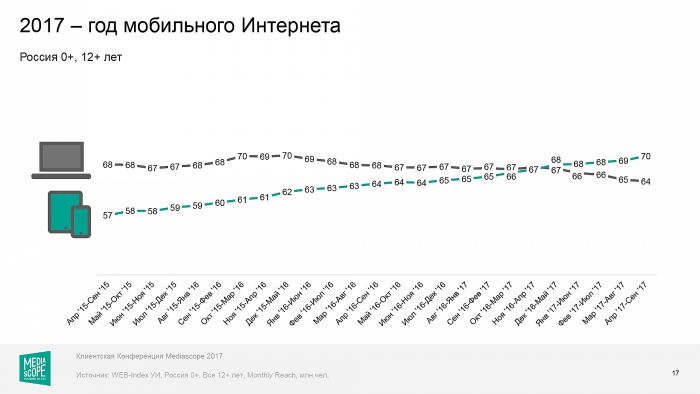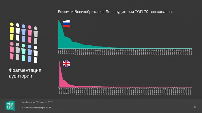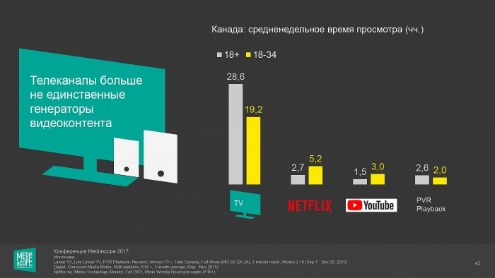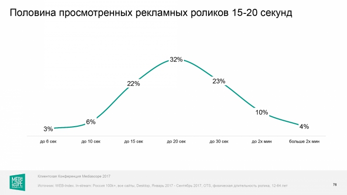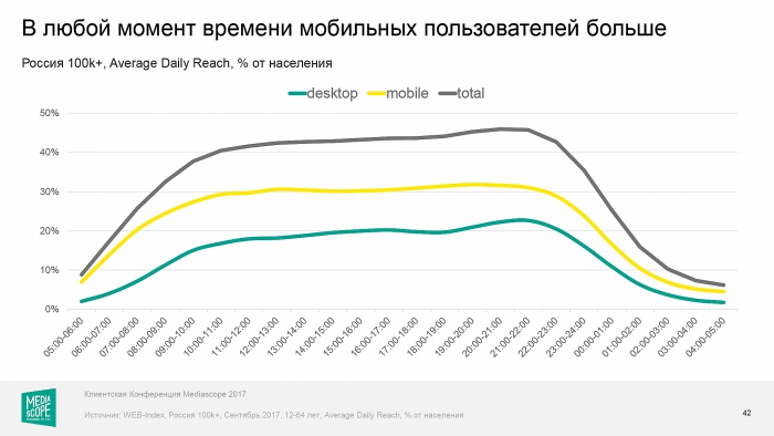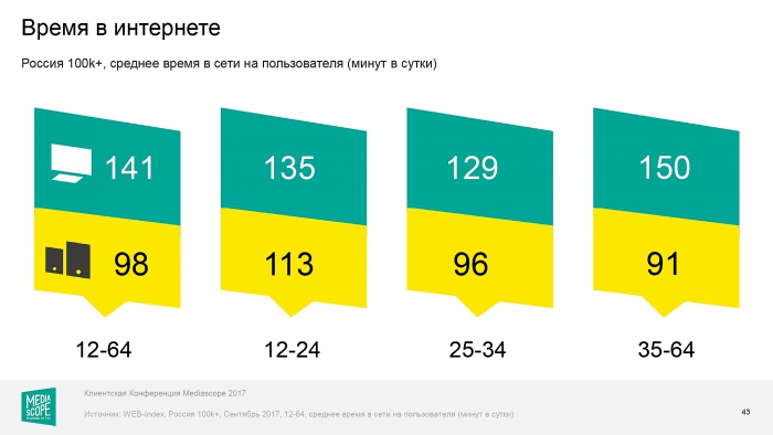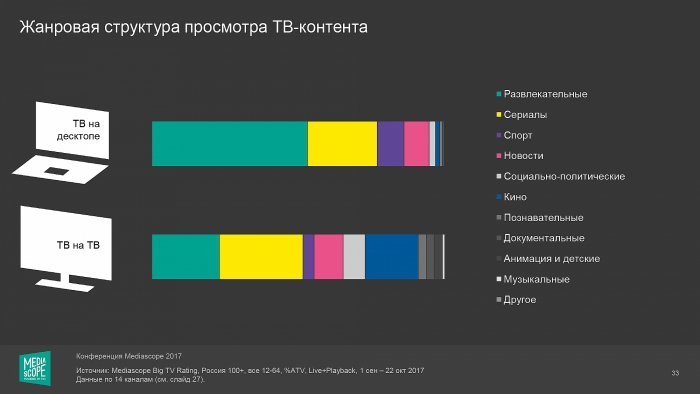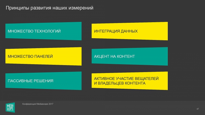 Исследовательская компания Mediascope на своей клиентской конференции объявила о том, что движется от измерения телевидения к измерению тотал-видео и планомерно следует этой стратегии. Во второй половине 2018 года измеритель предоставит данные по дачному (установочное исследование уже проведено) и мобильному телесмотрению, рассказала на конференции директор по телевизионным исследованиям Mediascope Ксения Ачкасова.