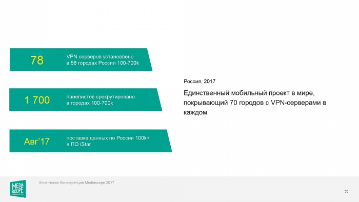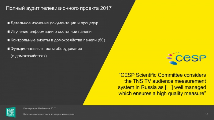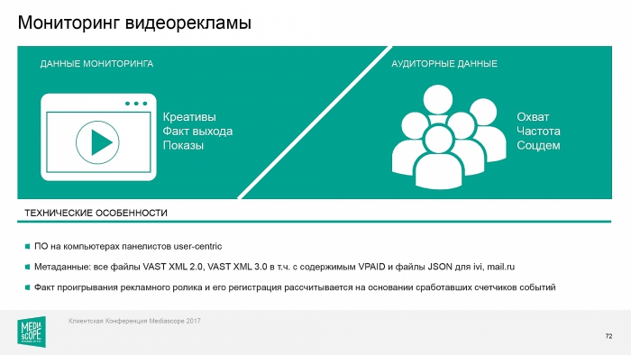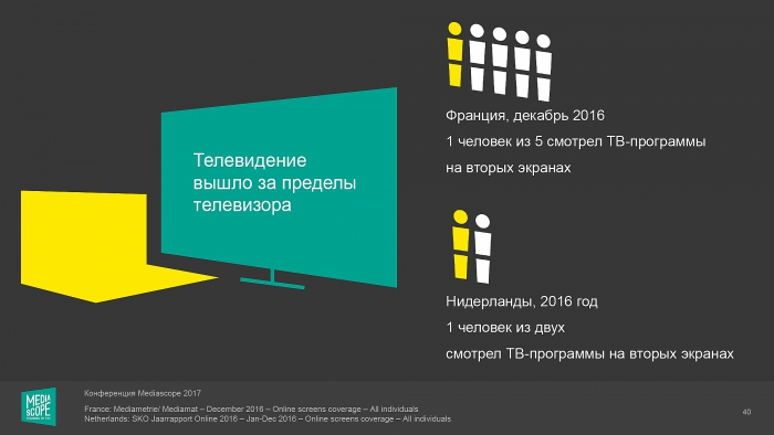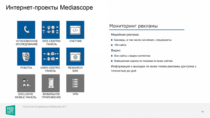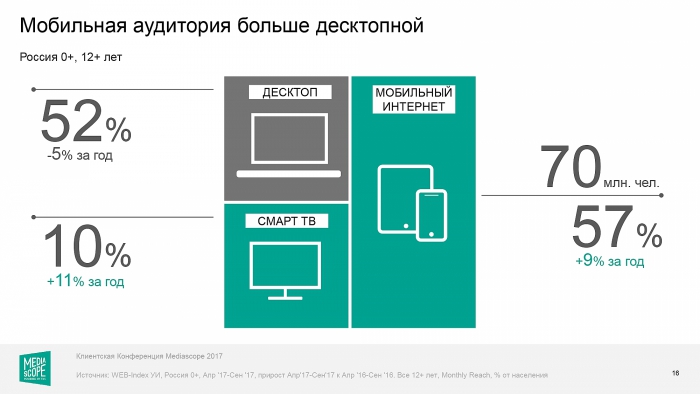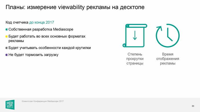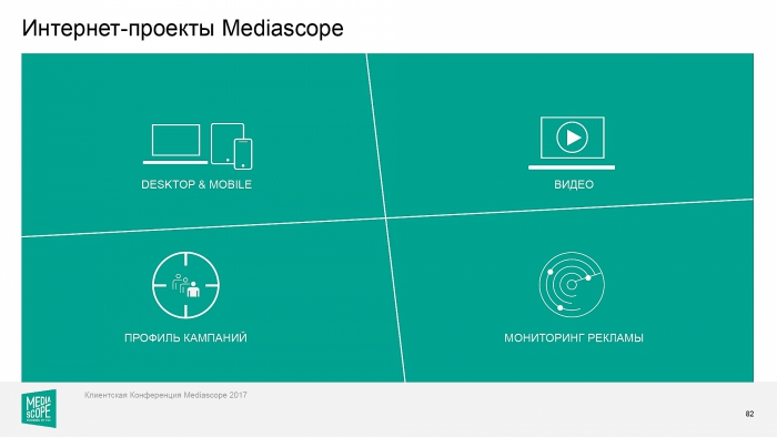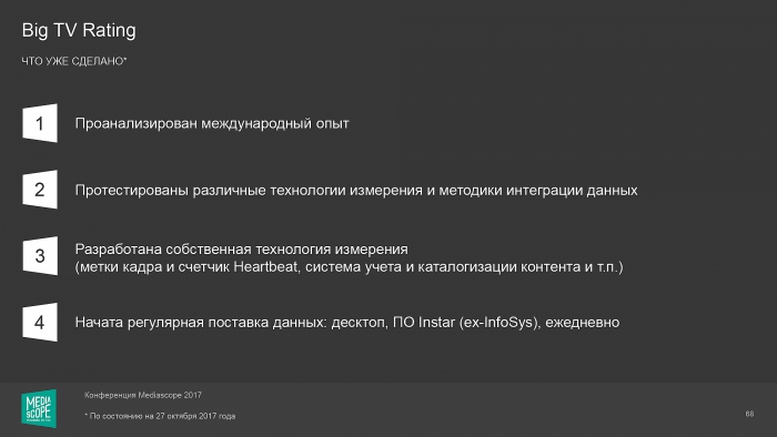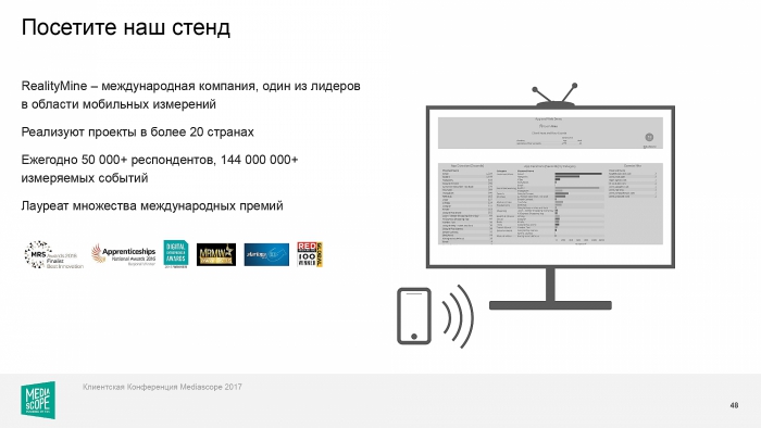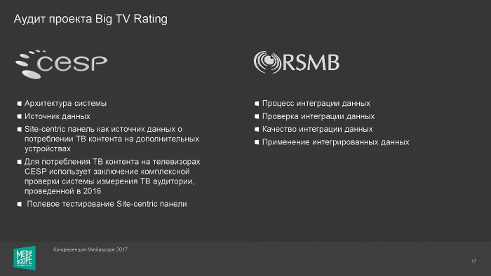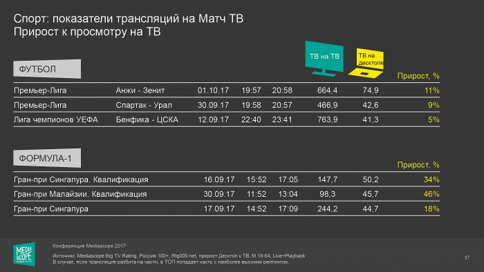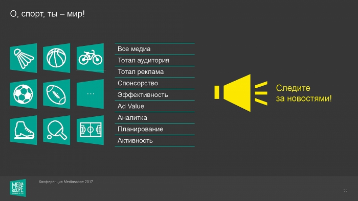 Компания Mediascope также анонсировала на конференции подготовку к измерению во всех медиа аудитории предстоящих в 2018 году спортивных событий и рекламы в них, в частности Чемпионата мира по футболу, который пройдет в России.