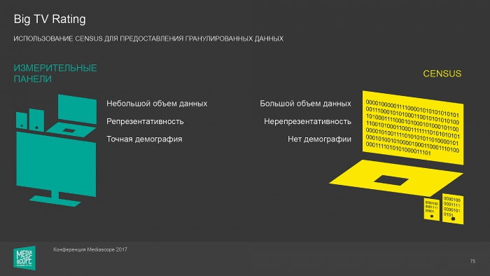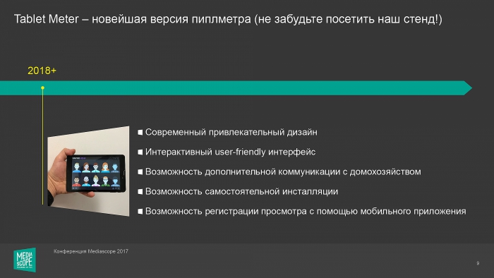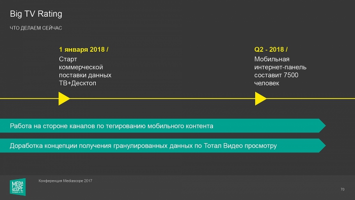 Во втором квартале 2018 года в Big TV Рейтинг войдут данные мобильной панели Mediascope размером 7,5 тысяч человек. Таким образом, появится возможность тегировать мобильный контент и учитывать телесмотрение с мобильных устройств.