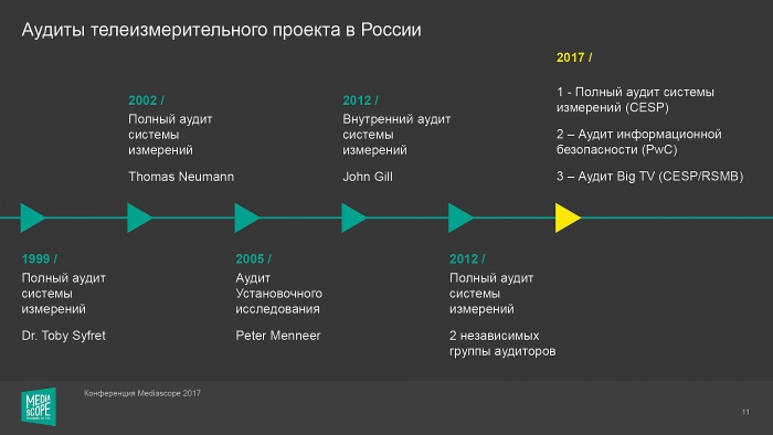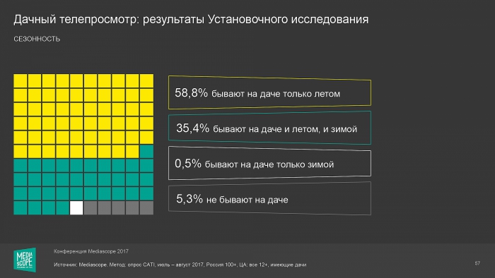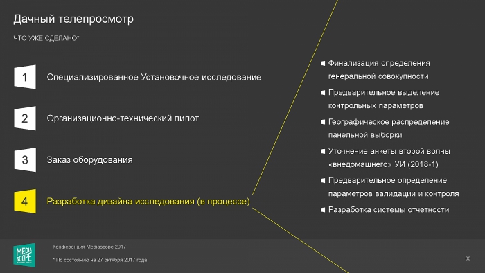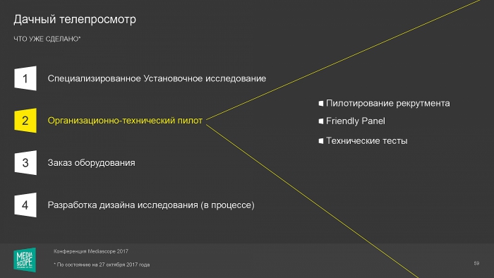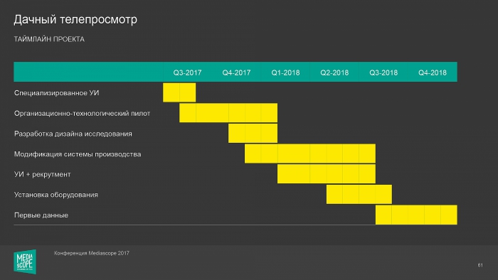 Mediascope уже провела установочное исследование по дачному телесмотрению в июле-августе 2017 года. На старте проекта выборка составила тысячу домохозяйств, генеральная совокупность аналогична основному проекту телеизмерений Mediascope. Установка оборудования для регулярных измерений начнется в мае 2018 года, а первые данные будут доступны рынку в четвертом квартале 2018 года.