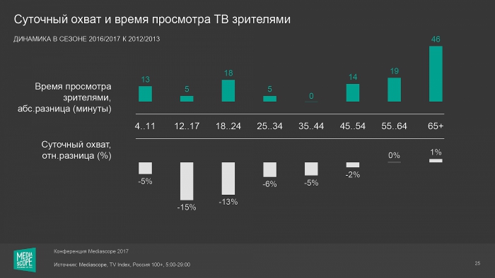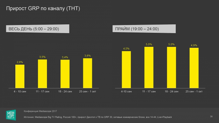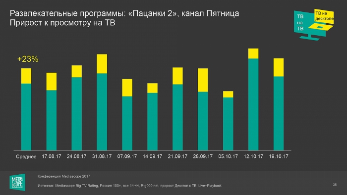 Например, смотрение программы “Пацанки 2” (канал “Пятница!”) в онлайне на десктопных устройствах прибавило к ТВ-рейтингам передачи, в среднем, +23%. По некоторым сериям “Пацанок 2” прирост составлял около +40%, отметила представитель Mediascope Ксения Ачкасова. Онлайн-смотрение сериалов дает их ТВ-рейтингам порядка +20%. Прирост GRP по каналу ТНТ равняется 3-5%, согласно озвученным данным.