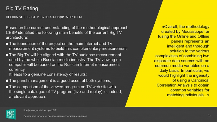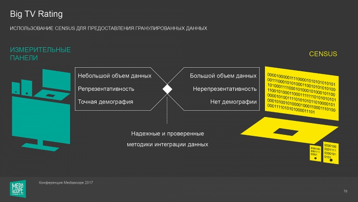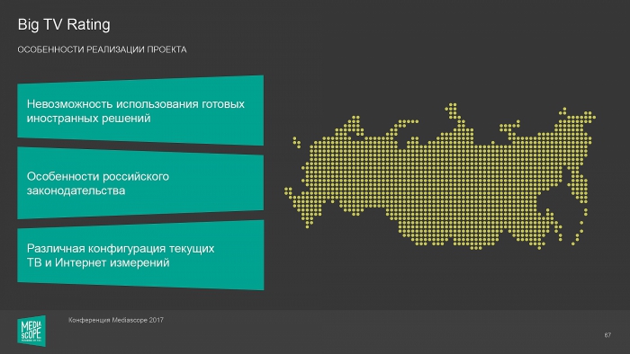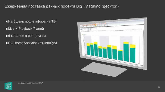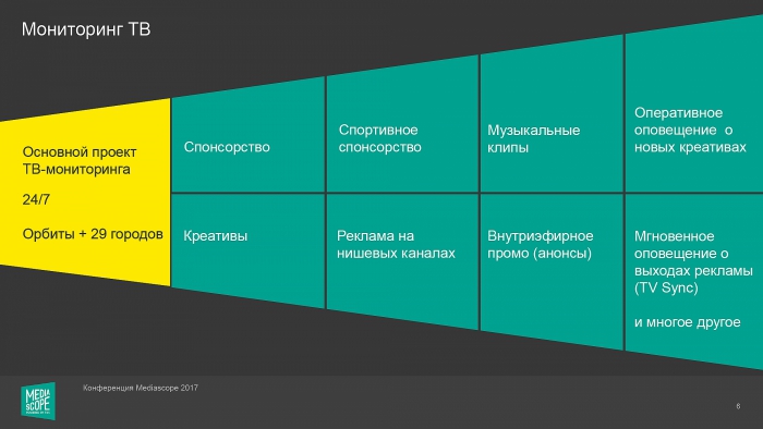 Big TV Рейтинг, один из ключевых проектов Mediascope, который основывается на тегировании телевизионного контента для измерения его аудитории в онлайне (десктоп) и последующего учета этих данных в телевизионных рейтингах, также планируется расширять, сообщила Ксения Ачкасова.