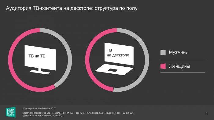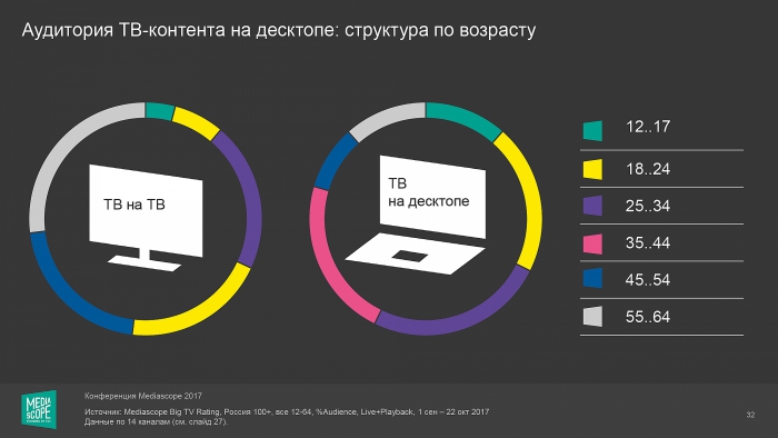 Десктопное телесмотрение добавляет к ТВ-рейтингам всего 0,7%, следует из данных Mediascope по 7 телеканалам (прямые трансляции и просмотр контента в день его трансляции на ТВ) в аудитории 12-64. В аудитории 18-24 этот прирост +2,2%. Однако по отдельным телепроектам он более значительный.