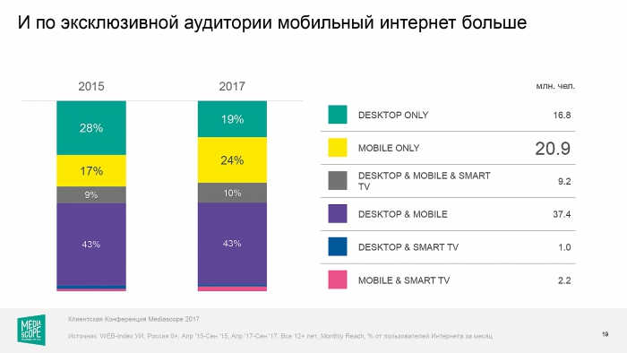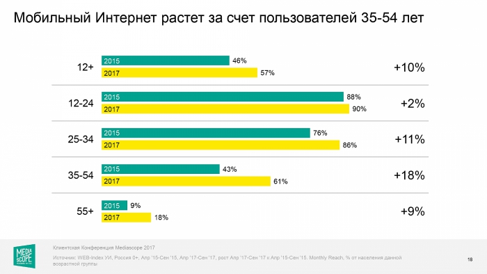 О начале измерений мобильного и загородного телесмотрения в 2018 году ранее говорил Sostav.ru первый заместитель генерального директора Национального рекламного альянса (продает рекламу на большинстве российских телеканалов) Сергей Коптев. Топ-менеджер НРА пояснял, что в 2019 году селлер планирует учитывать потребление ТВ-контента с мобильных устройств при продажах рекламы на телеканалах.