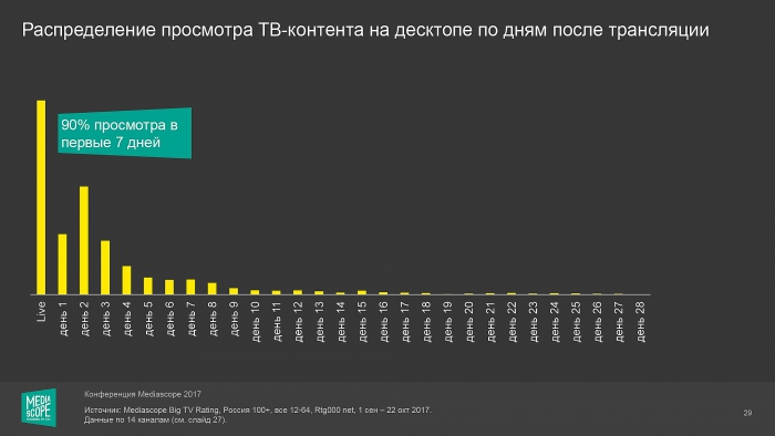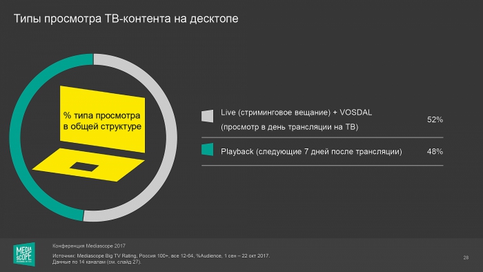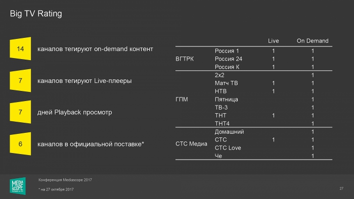 На клиентской конференции компания Mediascope представила свежие данные проекта Big TV Рейтинг. Сейчас 14 телеканалов тегируют контент по запросу (on demand): это каналы холдингов ВГТРК, Газпром-Медиа и СТС Медиа. Семь телеканалов тегируют live-плееры (прямые трансляции): Россия 1, Россия 24, Россия К, НТВ, Матч ТВ, ТНТ и СТС.