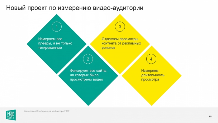 Изменения коснутся и интернет-измерений, в частности Mediascope начинает считать аудиторию видеоконтента всех плееров, а не только тегированных, как это было раньше. Кроме того, теперь фиксируются все сайты, на которых было просмотрено видео, сказала директор по интернет исследованиям Mediascope Инесса Ишунькина. Об этих планах ранее писал Sostav.ru со ссылкой на директора по мультимедиа-исследованиям MediaScope Михаила Райбмана.