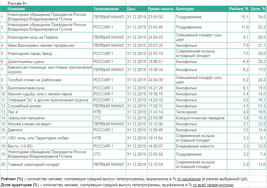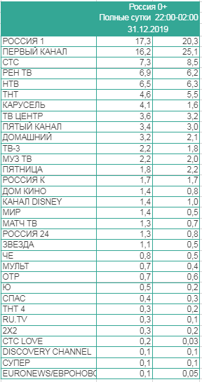 Лидером ночного (с 22:00 до 02:00) новогоднего телеэфира 2019 года стал «Первый канал». Новогоднее обращение президента традиционно пользуется большей популярностью у взрослой аудитории, а самыми рейтинговыми передачами 31 декабря 2019 года стали новогодние шоу федеральных каналов и советские кинофильмы, следует из отчёта Mediascope.