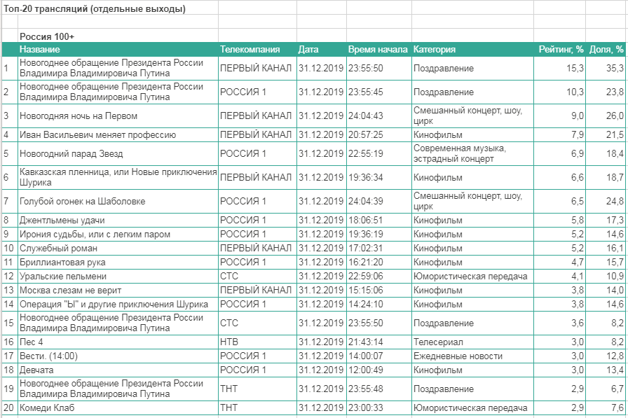Кроме новогоднего обращения Путина, в топ-5 попали еще три передачи, включая обе части «Новогодней ночи на Первом». Самым популярным фильмом оказалась легендарная комедия Леонида Гайдая «Иван Васильевич меняет профессию». В топ-10 также вошли «Джентльмены удачи», «Кавказская пленница, или Новые приключения Шурика», «Голубой огонек на Шаболовке», «Бриллиантовая рука» и «Ирония судьбы, или С лёгким паром!». На НТВ лидером стал телесериал «Пес 4», на СТС — «Уральские пельмени».