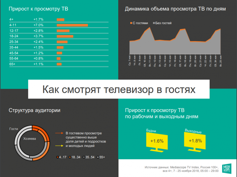 «Зрители, которые смотрят ТВ в гостях, достаточно молодые. По первым данным Mediascope, более 70% гостевого телепросмотра приходится на людей младше 55 лет, тогда как внутри домохозяйств на эту аудиторию приходится только чуть больше 50% просмотра», — комментирует директор по телевизионным исследованиям Mediascope Ксения Ачкасова.