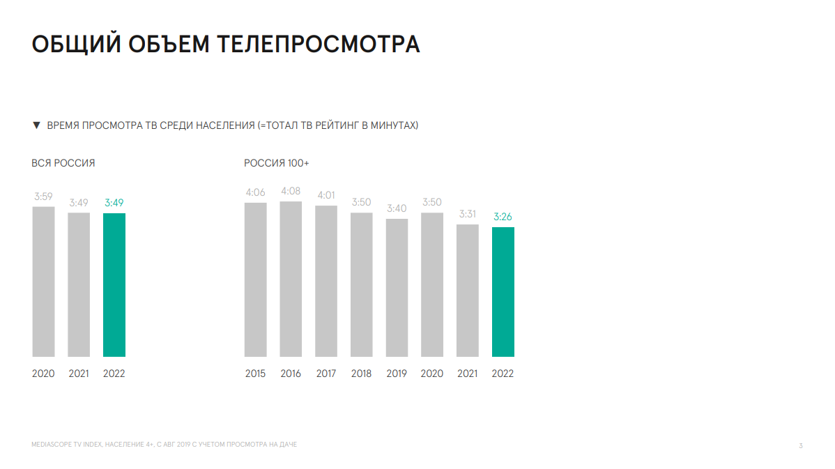 Время просмотра телевидения населением в городах России, где проживает больше 100 тыс. человек, по итогам 2022 года составило 3 часа 26 минут в сутки.