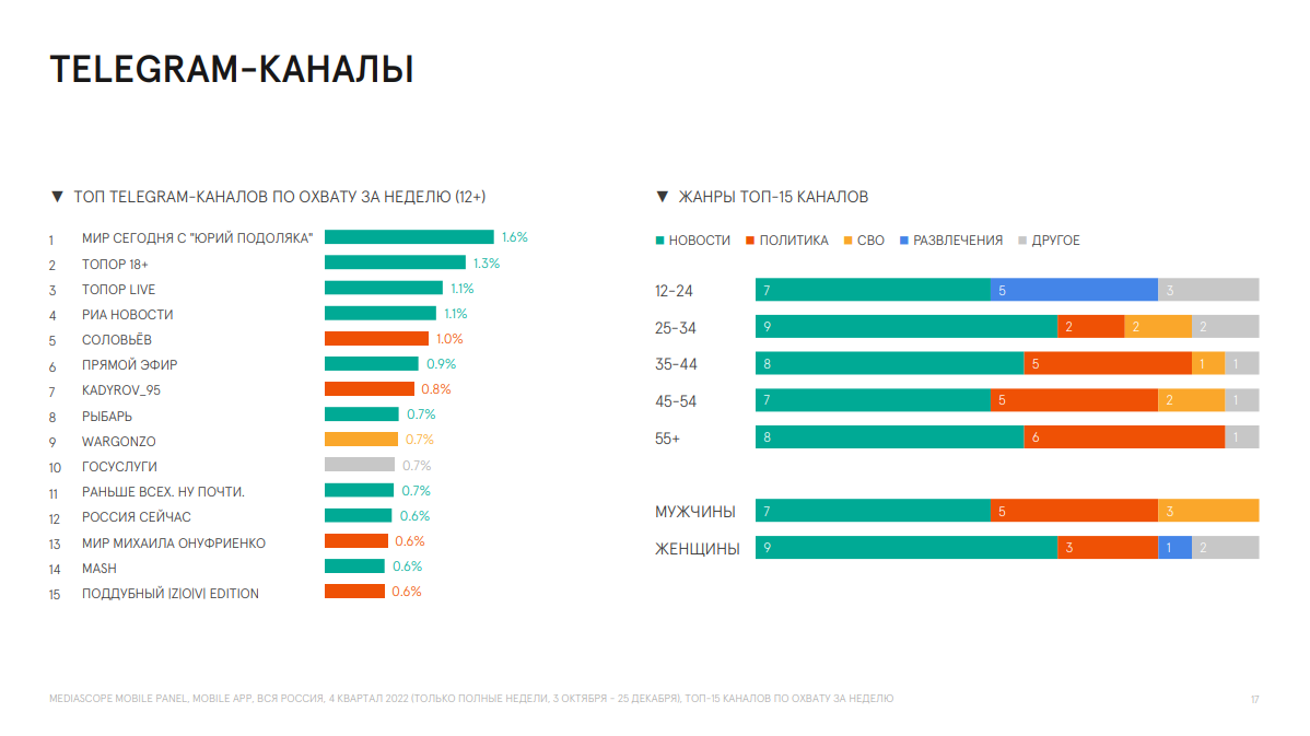 Средний житель России в возрасте от 18 до 24 лет проводит в Telegram полчаса в день. 33% времени использования Telegram приходится на Telegram-каналы. В списке самых популярных каналов лидируют новостные, при этом молодая аудитория, в отличие от более возрастной, читает также много развлекательных паблики.