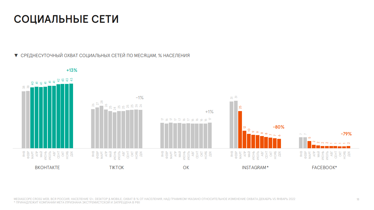 Среднесуточный охват «ВКонтакте» с марта по декабрь 2022 года вырос на 13%. У TikTok тот же показатель упал на 1%, у Instagram и Facebook (запрещённые в РФ соцсети; принадлежат компании Meta, признанной экстремистской и запрещённой в России) снизился на 80% и 79% соответственно.