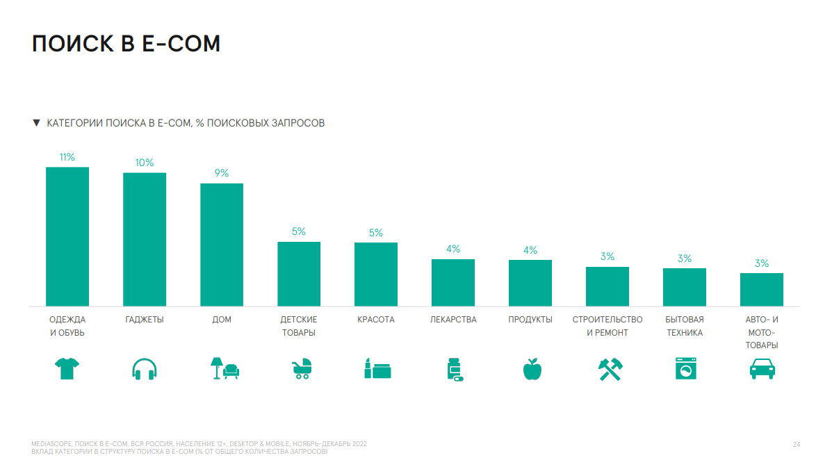 Объём e-commerce вырос во всех возрастных группах. Основной категорией поиска стала «одежда и обувь» — на неё приходится 11% всех запросов.
