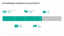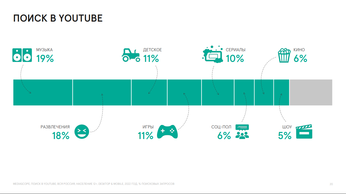Согласно структуре поиска на YouTube, видеохостинг остаётся развлекательной площадкой. На нём смотрят музыкальные видео (19%), развлекательный контент (18%), видео для детей (11%) и связанные с видеоиграми ролики (11%). Социально-политический контент составляет не более 6% в поиске на площадке. Доля YouTube от общего времени интернет-потребления в сутки составляет 15%.