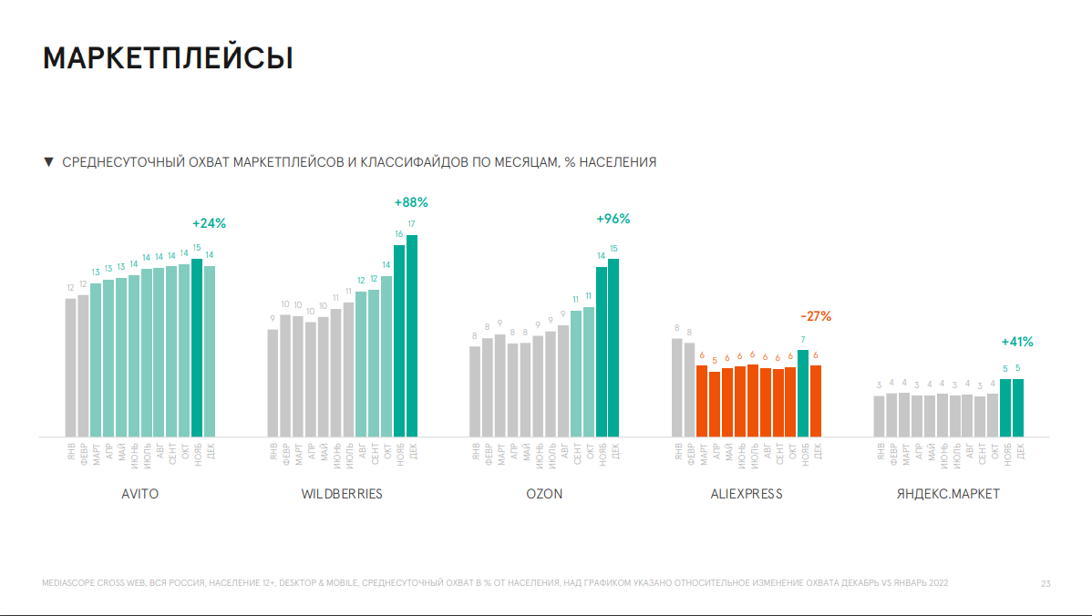 С января по декабрь 2022 года среднесуточный охват «Авито» вырос на 24%, Wildberries — на 88%, Ozon — на 96%. Среднесуточный охват AliExpress за тот же период снизился на 27%.