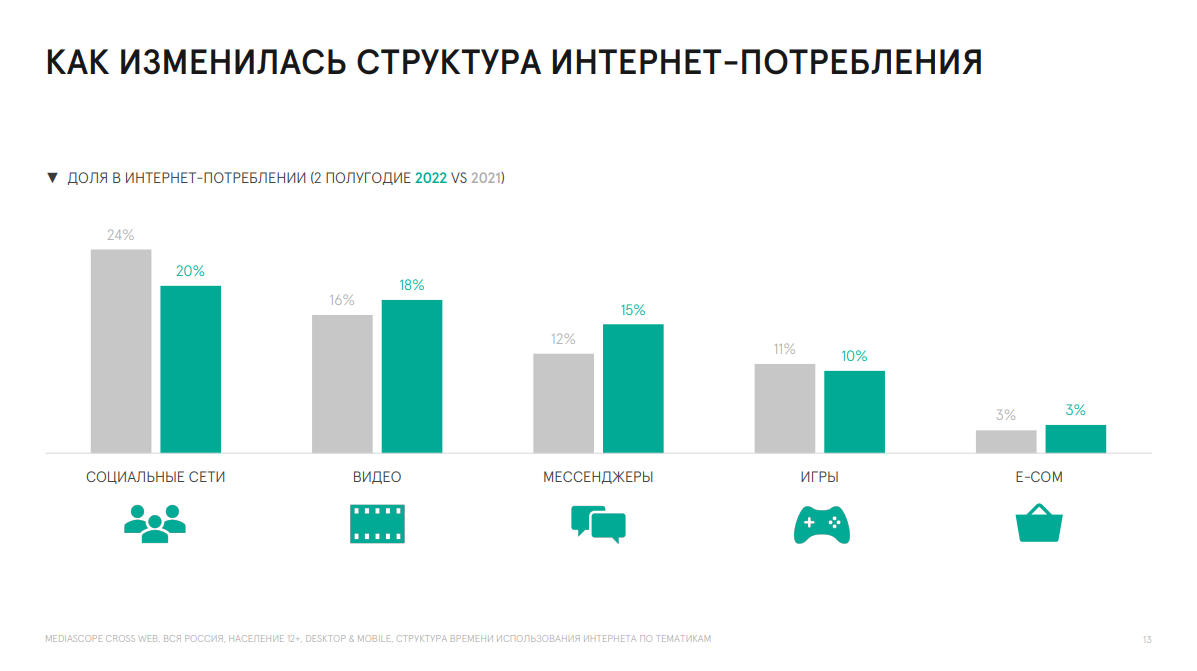 На CSTB.Ppo.Media также были обнародованы данные о структуре интернет-потребления. Аналитики выяснили, что 95,3 млн россиян в 2022 году ежедневно пользовались интернетом. По сравнению с 2021 годом, соотечественники стали реже заходить в соцсети и мессенджеры. При этом видеоприложения и мессенджеры стали у россиян популярнее.