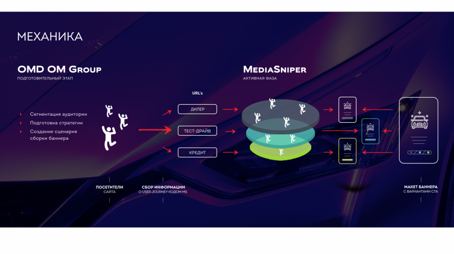 Для реализации кампании в автоматическом режиме MediaSniper «переобучили» свою платформу под конкретные задачи РК. Система в режиме real time находила в доступном для показов трафике пользователей, которые ранее посещали сайт Nissan.