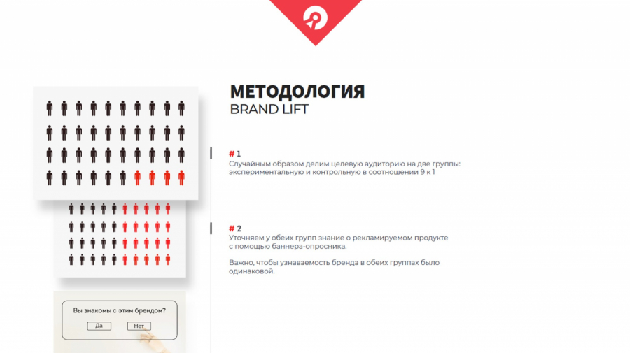 С поставленной же целью лучше справится исследование Brand Lift. Оценка влияния происходит путем проведения опросов. Сама механика выглядит следующим образом: перед запуском рекламной кампании целевая аудитория, на которую будет вестись ротация, делится в соотношении девять к одному. Большая часть — это основная ЦА, которая в будущем увидит рекламу, а меньшая (десятая) часть — контрольная группа, выключающаяся из ротации. Перед началом размещения обе группы участвуют в опросе, позволяющем выявить осведомленность участников о бренде. В идеале эти показатели у обеих групп должны быть идентичны.