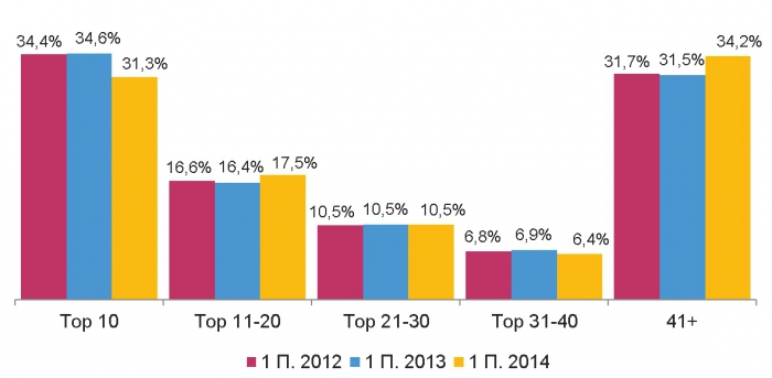 Продолжается снижение суммарной доли бюджетов, приходящихся на ТОП-10 крупнейших рекламодателей. Она сократилась с 34.6% в I пол. 2013 г. до 31.3% в I пол. 2014 г. При этом активизируются средние и небольшие (по телевизионным меркам) рекламодатели. С одной стороны, увеличение бюджетной доли рекламодателей, входящих в группу 41+ для телерекламного сегмента это хороший знак. Ведь в кризис, мелкие рекламодатели, не справляясь с финансовой нагрузкой, сокращают свои рекламные бюджеты.