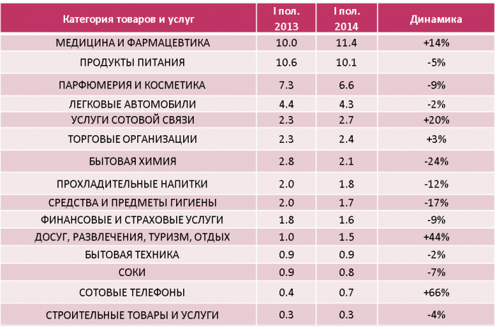 Перейдем к анализу сегмента в разрезе рекламируемых групп товаров и услуг. Несмотря на экономические колебания, реклама лекарственных средств уже не первый год демонстрирует выдающуюся динамику. За I пол. 2014 г. «фармацевты» увеличили свои бюджеты на 14% по сравнению с I пол. 2013 г.
