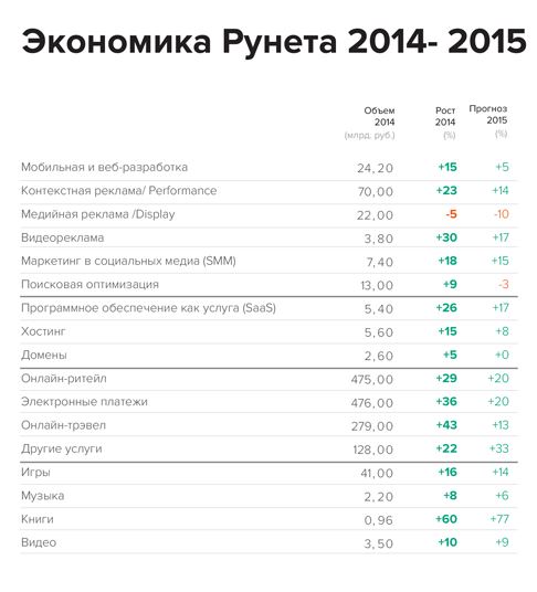 Напомним, что по итогам 2014 года медийный сегмент упал на 5% (до 19,1 млрд рублей), рынок SMM-услуг подрос на 1% (до 7,3 млрд рублей), видеореклама прибавила 50% (до 4,8 млрд рублей).