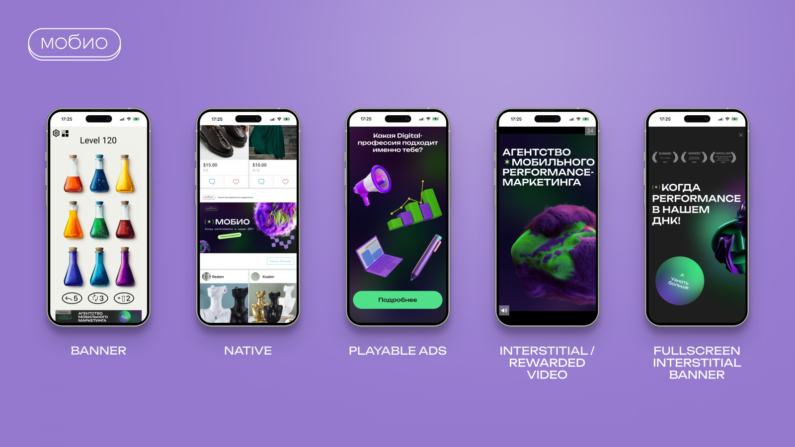 - Playable ads (интерактивная реклама) — полноэкранный интерактивный формат, вовлекающий пользователя во взаимодействие. Часто его используют для рекламы мобильных игр, предлагая поиграть в демо-версию без скачивания, но также playable ads можно использовать и в других вертикалях, предоставляя пользователю возможность пройти тест, составить коллаж или вовлечься в игровую механику.
