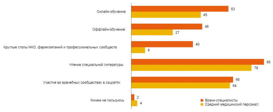 Почти все читают специальную литературу, онлайн-курсами пользуются чаще, чем оффлайн-формами обучения. При этом методы повышения квалификации, используемые врачами-специалистами, часто, хотя и не всегда, отличаются от действий медицинских сотрудников со средним специальным образованием (далее, «врачи» и «медсестры»). Например, и те, и другие достаточно часто бывают вовлечены в общение в «медицинских» группах и сообществах в соцмедиа, а вот оффлайновые формы взаимодействия с коллегами врачи используют гораздо чаще, чем медсестры.