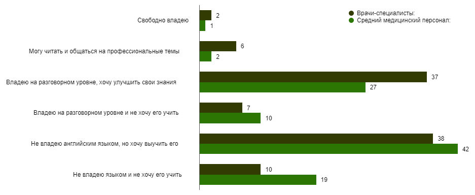 Как показало исследование, реально владеют английским не более трети опрошенных медиков, однако почти половина хотела бы его выучить. Среди людей, которым хватает родного языка, преобладают медики со средним специальным образованием.