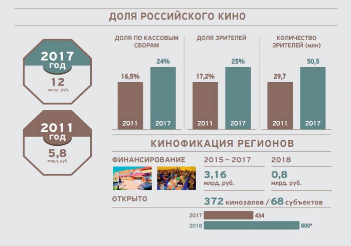 «Общее количество зрителей на сегодняшний день 50,5 млн человек — прирост плюс 20,5 млн по сравнению с 2011 годом. Соответственно, кассовые сборы российского кино с 5,8 млрд руб. до 12 на сегодняшний день», — сообщил Мединский на заседании комитета Госдумы по культуре.